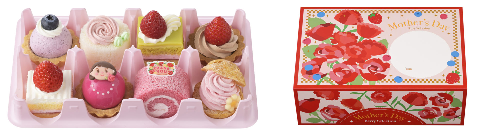 苺ホイップクリームにママのチョコを飾った「ママベリータルト」、苺やブルーベリーを宝石に見立てて飾ったケーキなど、ベリーづくしの8種類。カーネーションやバラのイラストをデザインした華やかなBOX天面は、メッセージが書けるようになっています。スイーツと一緒に気持ちも贈りませんか?
