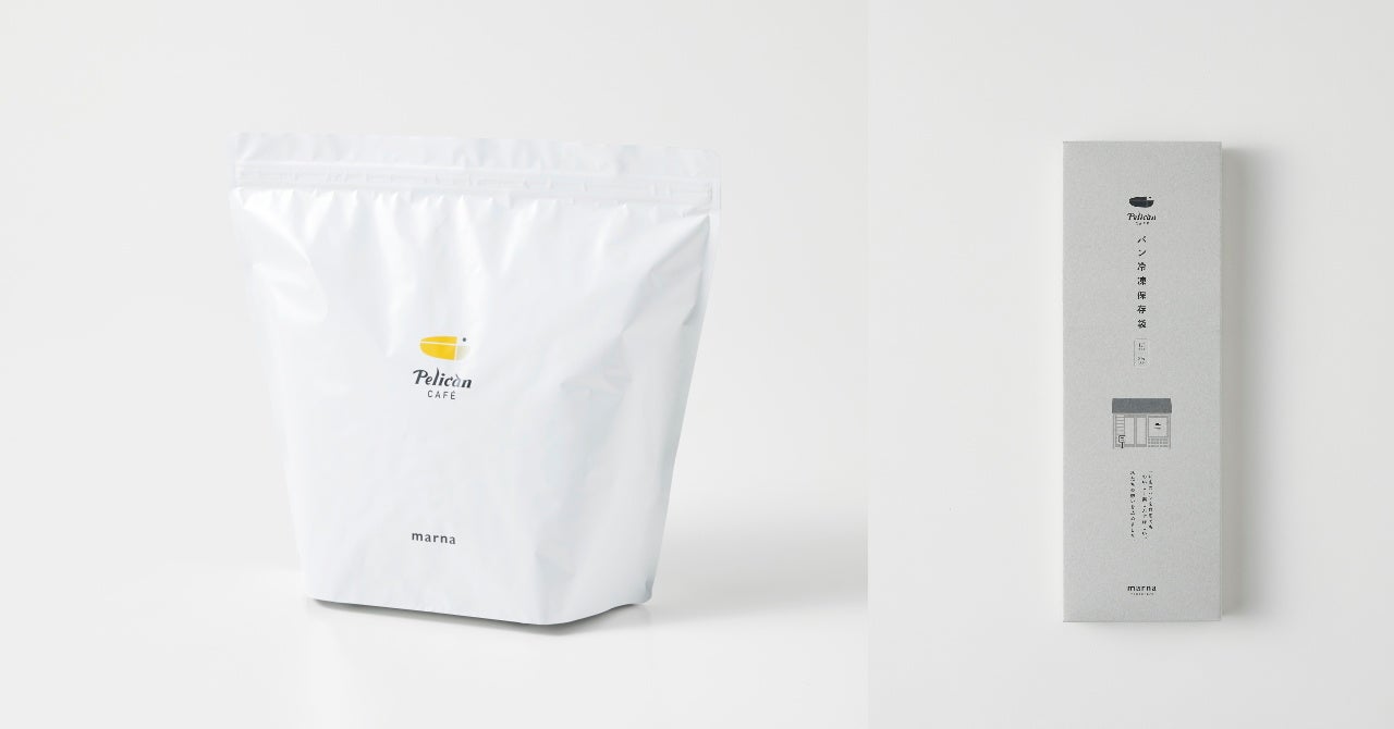 『Pelicanパン冷凍保存袋1斤』は、白をベースにした袋の片面に「ペリカンカフェ」のロゴを、反対側にはお店のイラストを配置し、シンプルであきのこないデザインにしました。ペリカンの食パン一斤がぴったり入るサイズです。パッケージは、ギフトにもおすすめの箱型の仕様にしました。