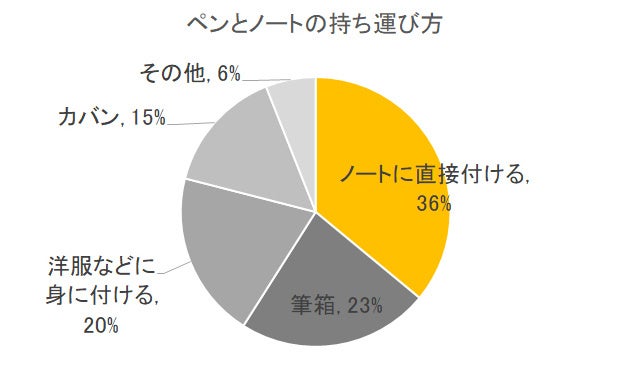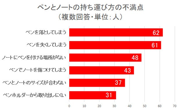 ① デジタル化・ペーパーレス化の時代でも、社会人の55%がノートを使用していると回答。主なペンとの持ち運び方は、「クリップなどで直接ノートにつける」人が多いが、「ペンを落としてしまう」などノート使用者の86%が潜在的な不満を抱えていることがわかりました。