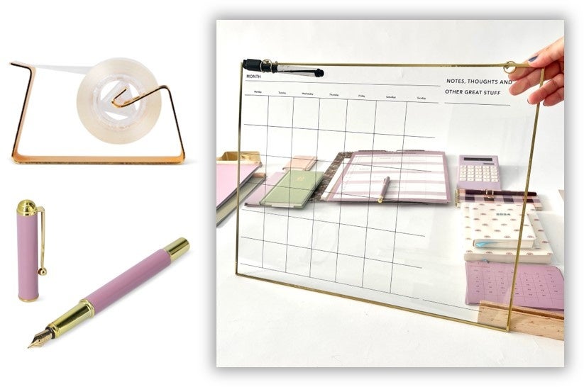 高級感のあるゴールドがポイントの個性派ステーショナリー。ガラスで出来たプランナーボードに予定を書き込んで。