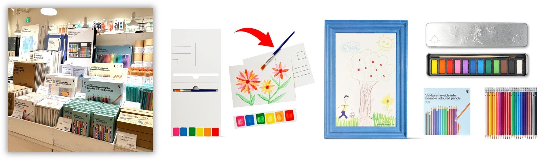額縁つきのスケッチブックはそのまま飾れる代物。持ち運びやすい絵具に、何度も消せる色鉛筆で画伯になろう。