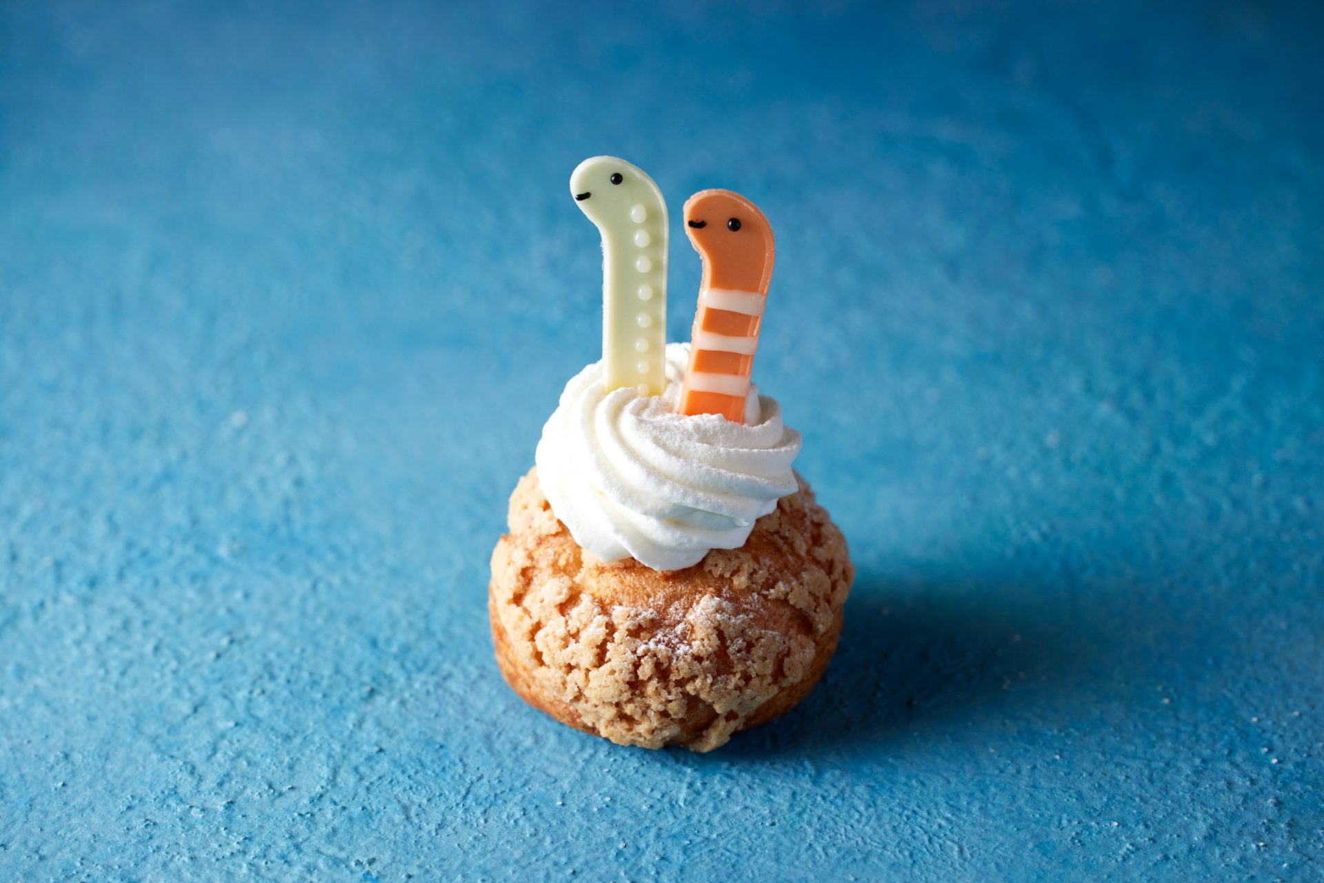 ホイップクリームから顔を出すニシキアナゴとホワイトスポッテッドガーデンイールが見た目にも可愛らしい一品です。