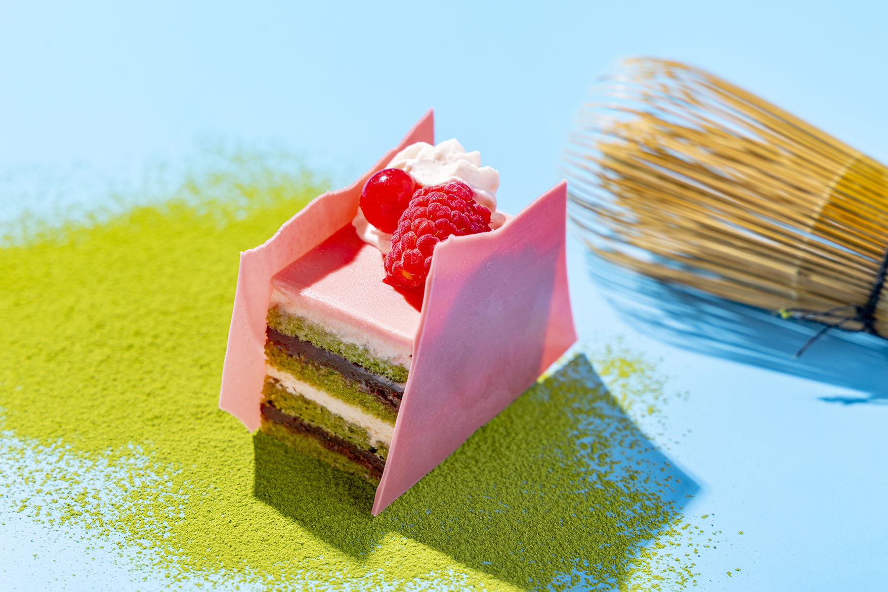 抹茶のビスキュイ、わさびのガナッシュ、グァバのバタークリームを重ねたオペラケーキ。抹茶とトロピカルな香りが意外にもマッチし、クセになる味わいに。
