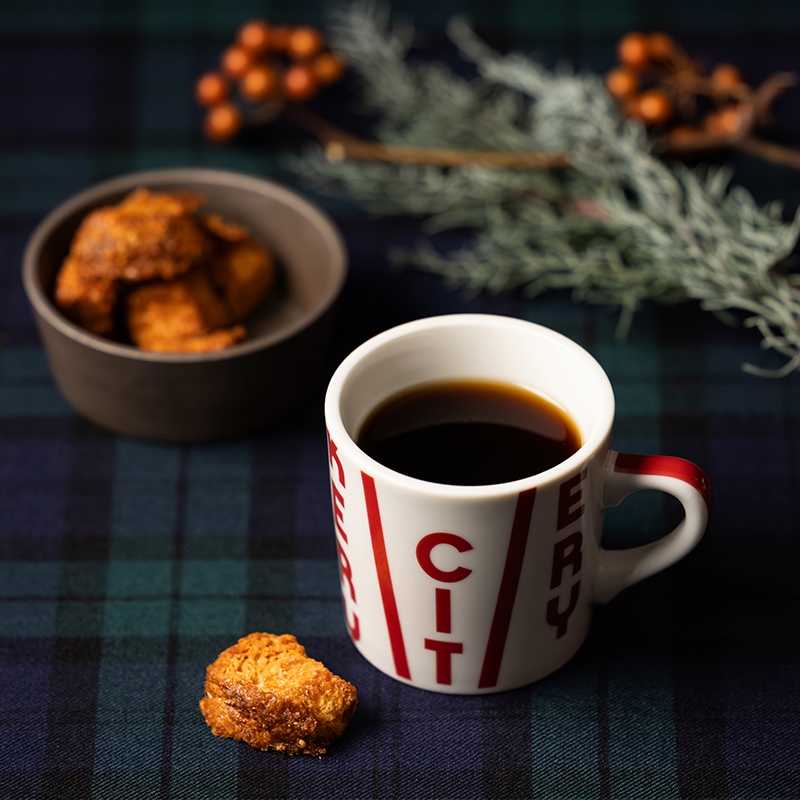 全面にTHE CITY BAKERYのロゴパターンを配した、大人気のマグカップ。ホリデーシーズンをイメージした落ち着いた赤でまとめました。