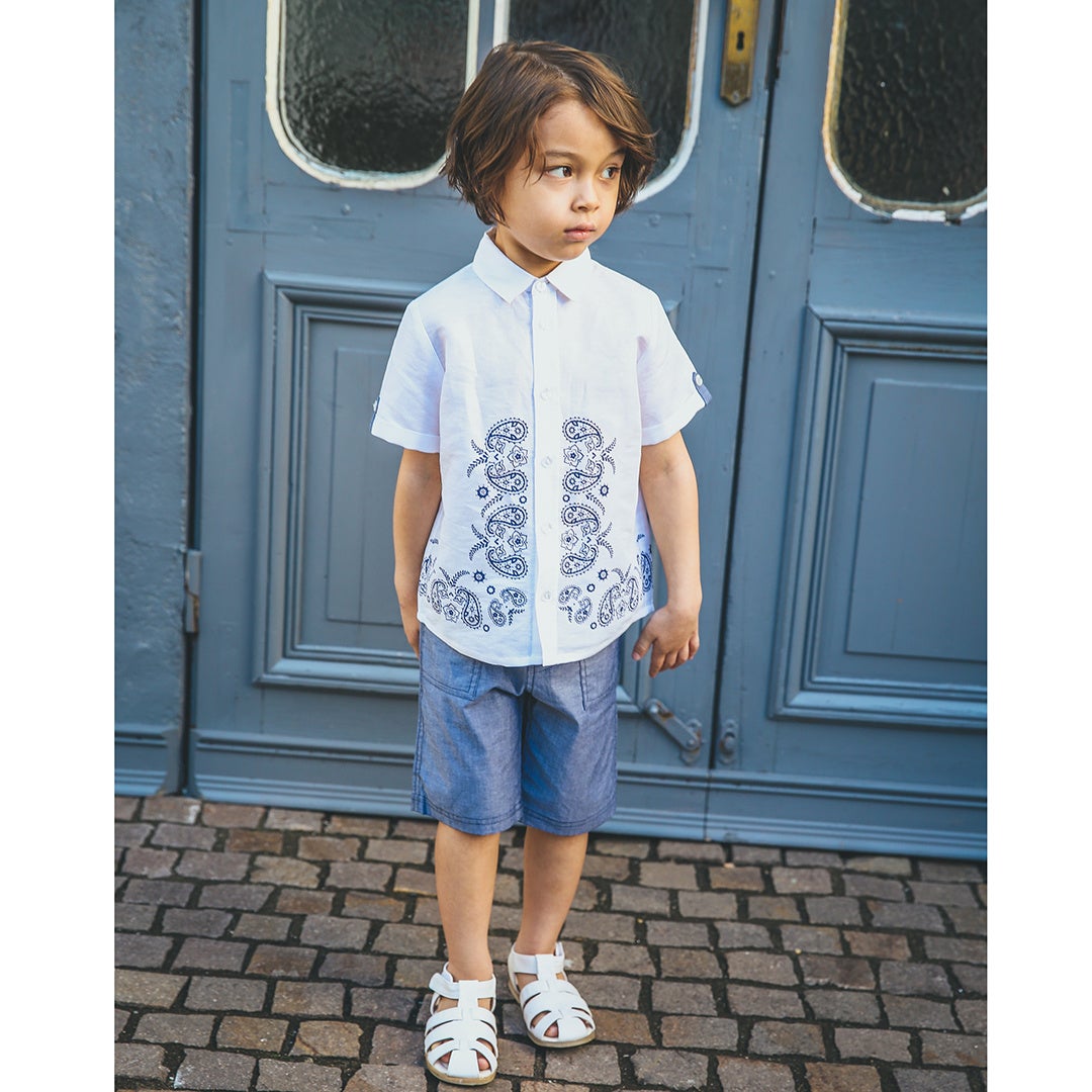 シャツにも同様に、ほどよい張り感と縦横の織りの透け感が特徴のスラブガーゼ素材を使用し、 ペイズリー柄を繊細なプリントで表現しています。 袖口のタブにはボトムと同じダンガリー素材を使用しているので、 上下でばっちりコーディネートが決まります。
